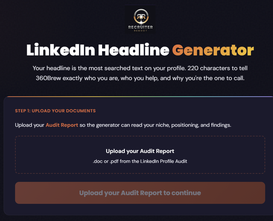 Your headline is the first thing the algorithm reads and the first thing a client sees. The generator builds three options based on your niche and audience, written for how LinkedIn actually ranks recruiters now.