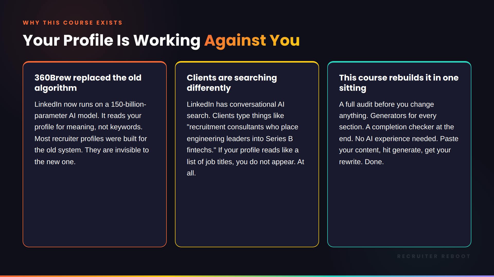 LinkedIn replaced its entire search algorithm in 2025. The new system, 360Brew, is a 150-billion-parameter AI model that reads your profile for meaning, not keywords. If your profile was built before this change, it is not being ranked. This course exists because most recruiters do not know the algorithm changed, and the profiles they spent years building are now invisible to the clients searching for them.
