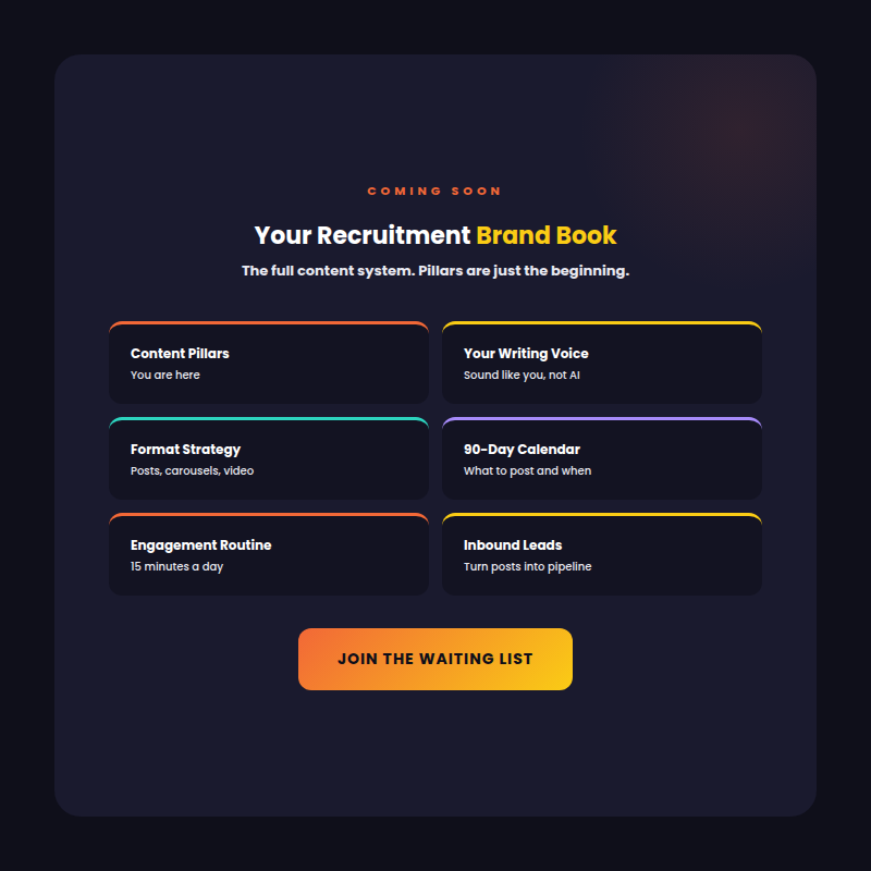 Your pillars tell you what to post about. Your Recruitment Brand Book covers your writing voice, format strategy, 90-day calendar, engagement routine, and how to turn posts into inbound leads. Join the waiting list.
