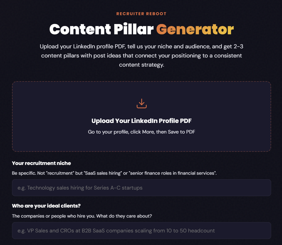 Input your niche, your audience, and your background. The generator produces three named pillars with sample post angles for each one. No brainstorming. No guessing. Walk away with a plan for what to post.