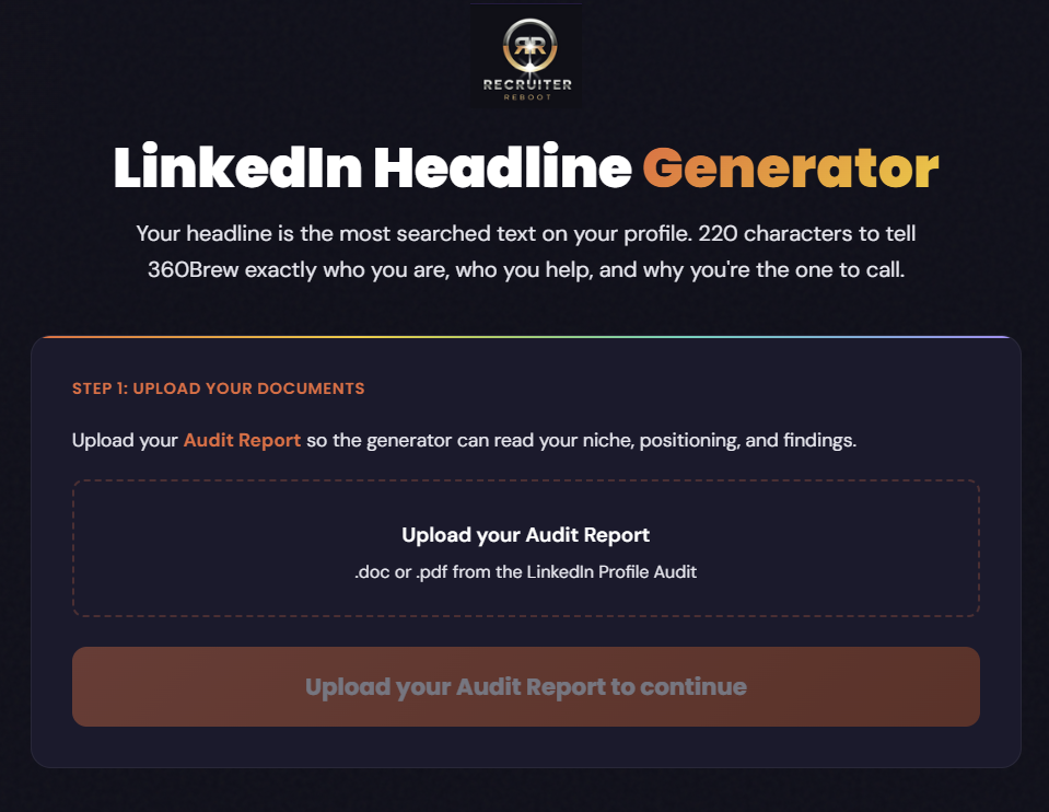 Input your specialism, the level you recruit at, your geography, and your key differentiator. The generator produces three headline options: an Authority version, an Outcome version, and a Niche-Specific version. Pick one and publish.