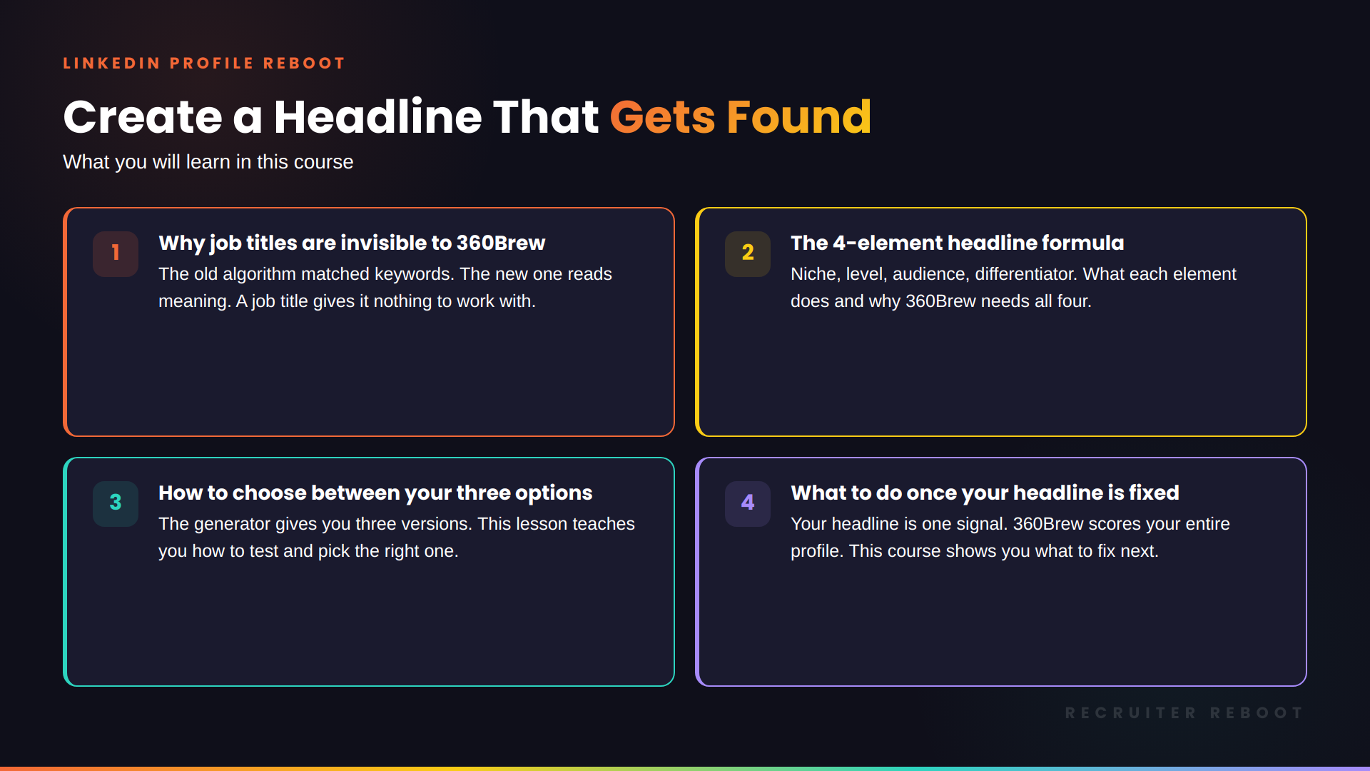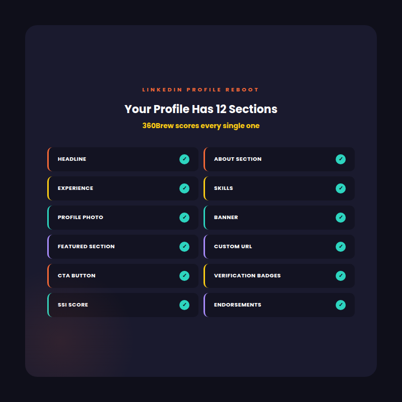 A strong headline gets 360Brew's attention. But the algorithm scores your entire profile. The LinkedIn Profile Reboot course rebuilds every section with its own generator. Use code REBOOT10 for 10% off.