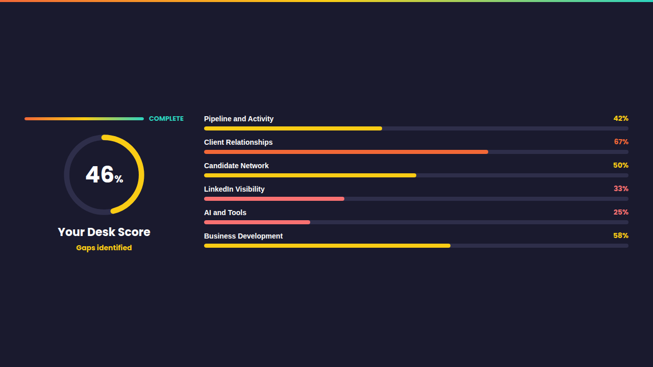 Most recruiters know something is not quite right on their desk but cannot pinpoint exactly where. The pipeline feels thin one month and overloaded the next. Clients go quiet. The BD routine slips. AI tools sit unused. This scorecard asks 24 honest questions across the six areas that determine whether your desk is actually working for you: pipeline, clients, candidates, LinkedIn visibility, AI adoption, and business development. Your results are instant, colour-coded, and prioritised. It does not matter whether you are full 360, delivery focused, or business development. The questions are tailored to your role the moment you start.