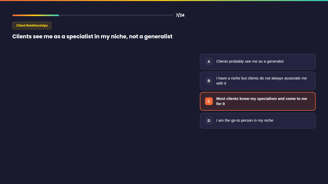 Do clients come back without you chasing? Do they see you as a specialist or a generalist? This section scores the strength and depth of your client relationships and whether they are growing or just surviving.