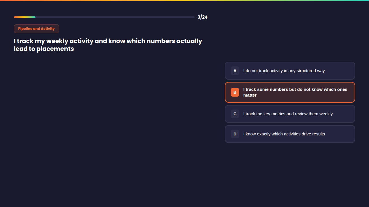 Are you tracking the numbers that actually lead to placements? Or just the ones that look busy? This section scores whether your pipeline is balanced, your brief flow is consistent, and your BD routine is holding up.